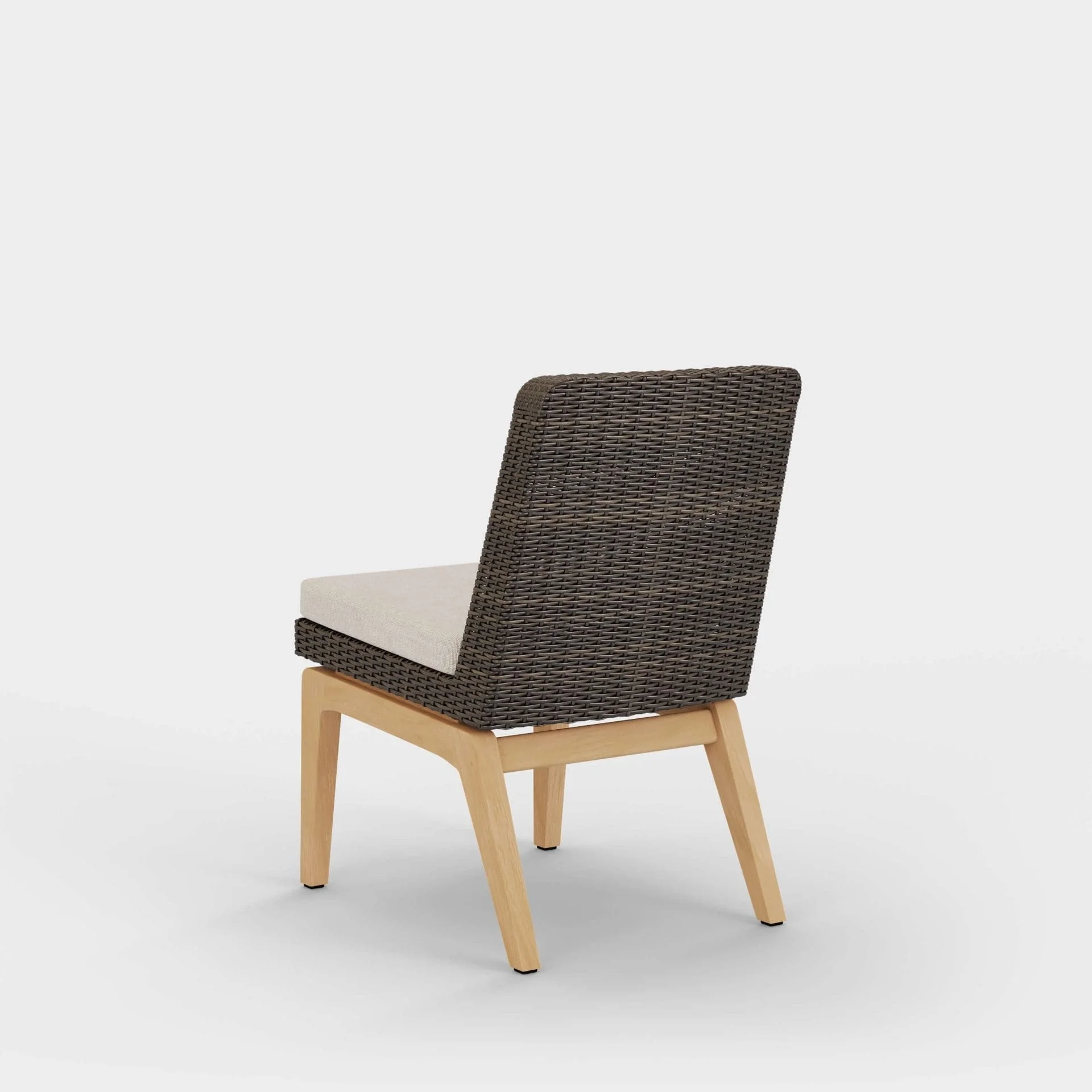 Woven fiber in a rich bronze hue that contrasts nicely with the natural, sanded teak wood finish
